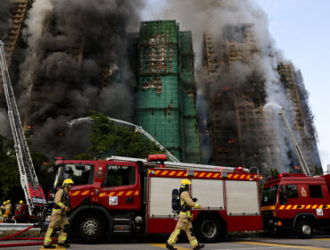 Firefighters work as efforts are underway to extinguish flames engulfing bamboo scaffolding across multiple buildings at the Wang Fuk Court housing estate in Tai...