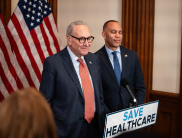 House Democratic Leader Hakeem Jeffries (D-N.Y.) and Senate Democratic Leader Chuck Schumer (D-N.Y.) are joined by other Senate and House lawmakers from the Democratic...