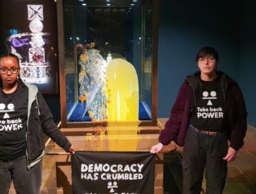 Published: 10:01pm, 6 Dec 2025Updated: 1:25am, 7 Dec 2025 Four protesters have been arrested after custard and apple crumble was thrown at a display...