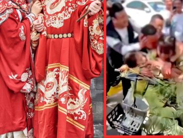 Shocking footage of two bridesmaids in China being taped to an electric bike and forced to kiss strangers has ignited widespread outrage over vulgar...
