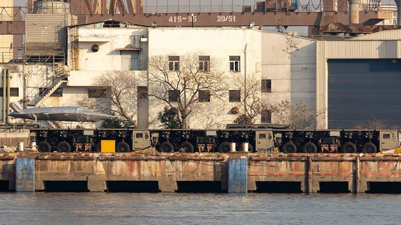 Some images circulating online since the weekend show three linked eight-wheeled low-loader trucks in a line with a large combat drone mounted on a shuttle-like fixture at the rear.