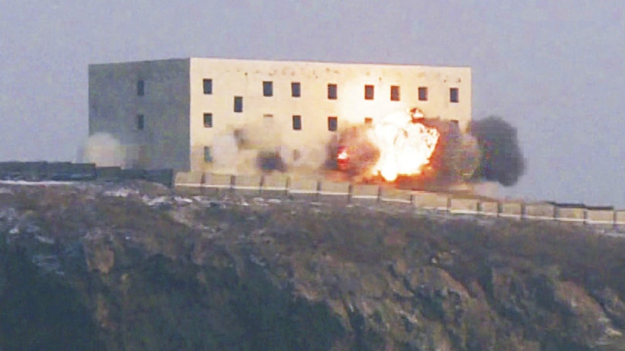 A missile moments before hitting its target. Photo: KCNA via AFP