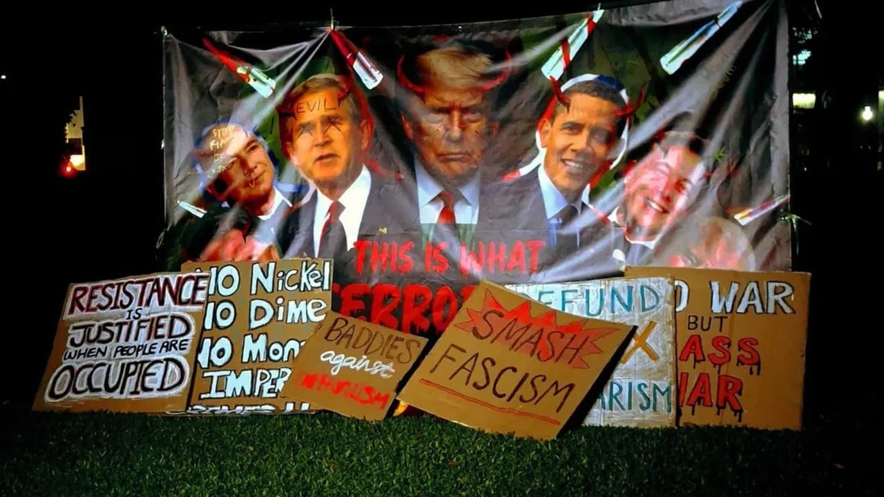 In a rare public protest in Singapore, hundreds gathered in Hong Lim Park over the weekend to denounce the “US war machine”. They brandished placards and banners, including one with horns drawn on US…